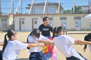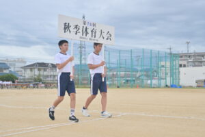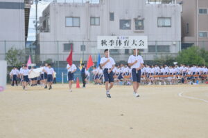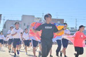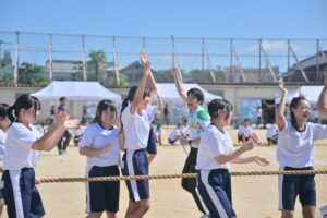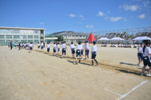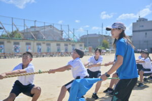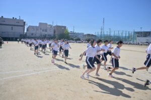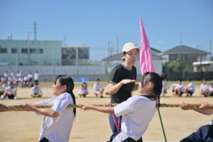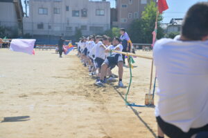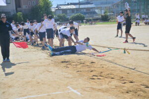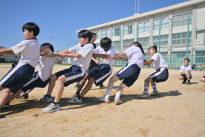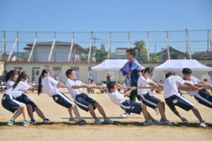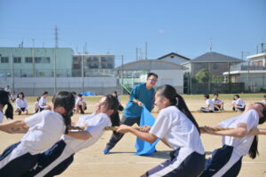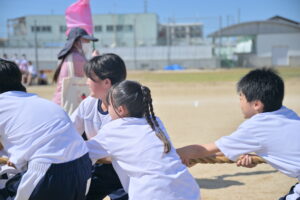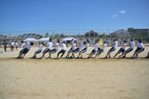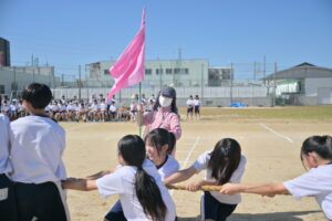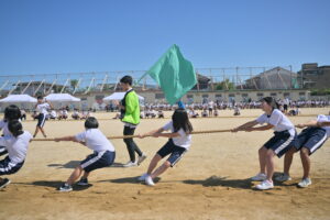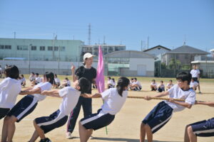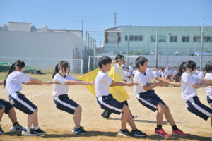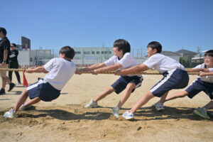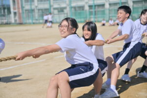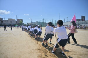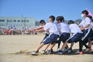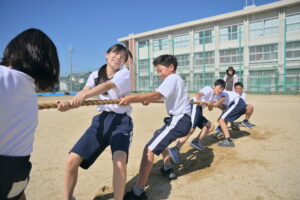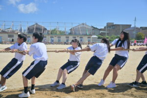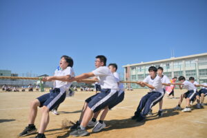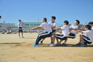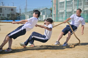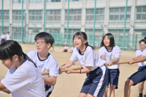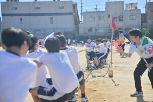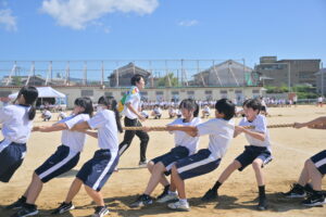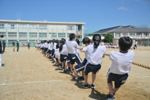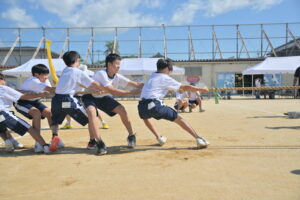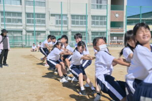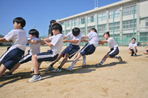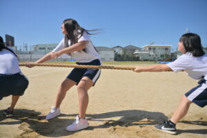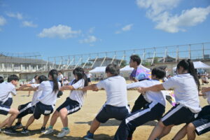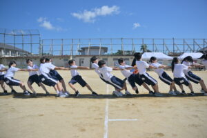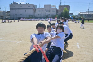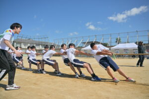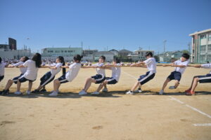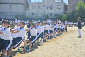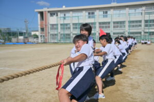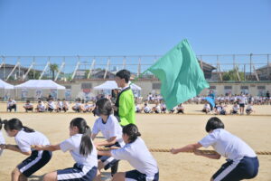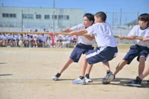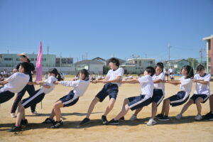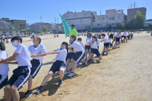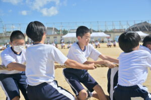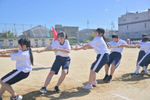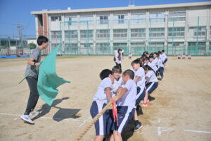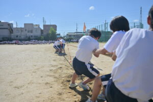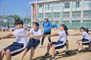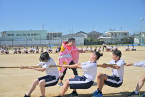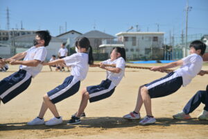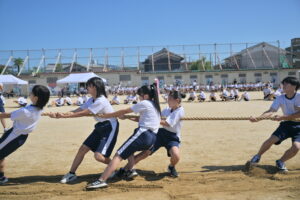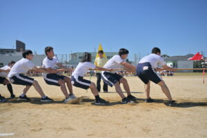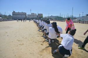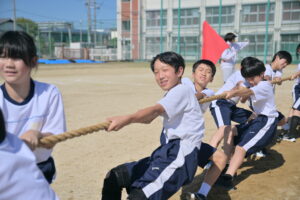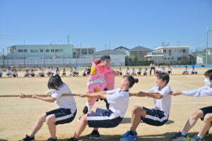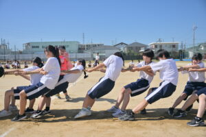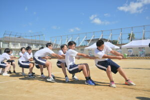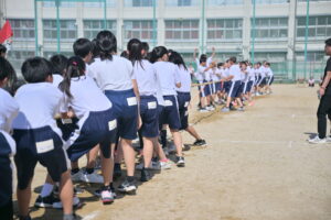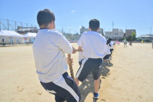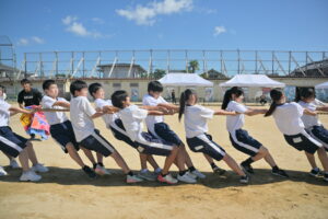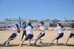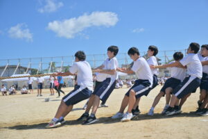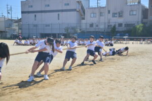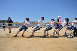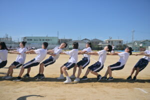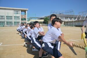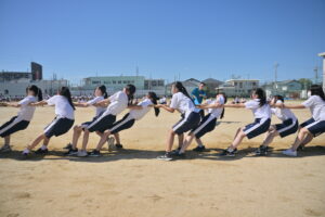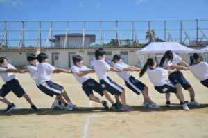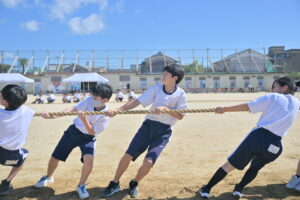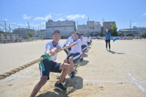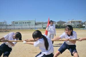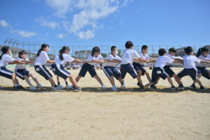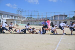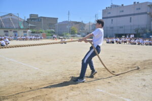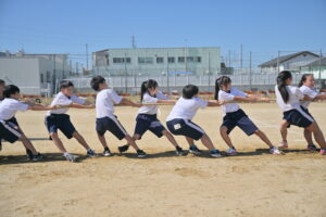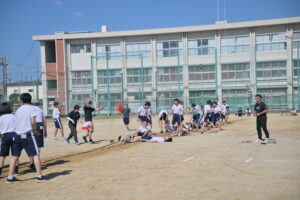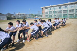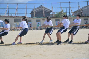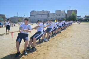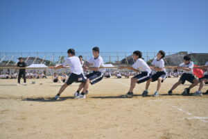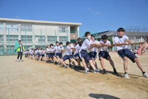 10月16・17日,体育大会の予行練習がありました。16日は雨天のため,残りの競技を翌日に行っています。予行では綱引きの予選がありました。この予選で組合せや順位が決まるので,みんな必死で綱を引っ張りました。来週は体育大会です。楽しみですね。